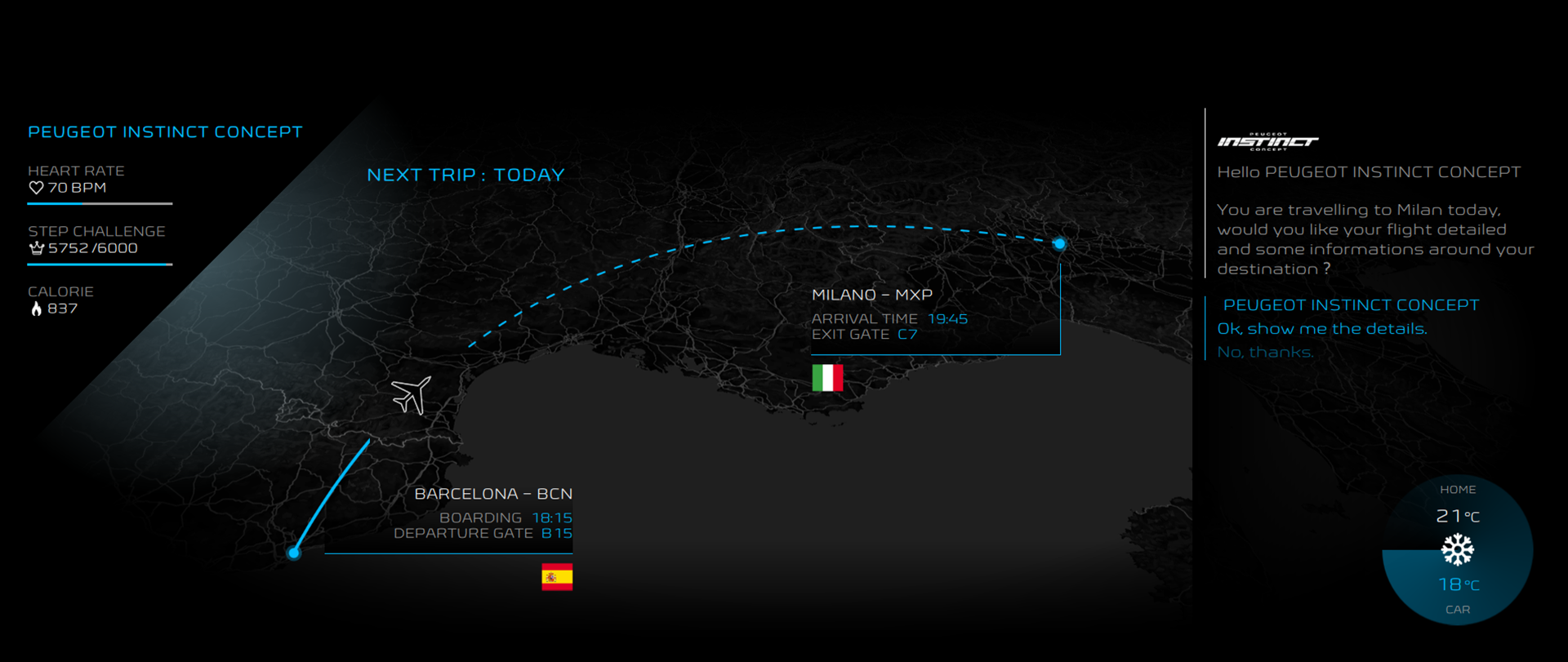 PEUGEOT CONCEPT modeļa izveidē esam iedvesmojušies no dabas un jo īpaši no cilvēka. Cilvēks iegūst neatkarību tad, kad ir apguvis vidi sev apkārt. Tieši tāpat PEUGEOT INSTINCT CONCEPT ir balstīta uz padziļinātu apguvi jeb mācīšanos, lai savam lietotājam izveidotu individuālu profilu. Lai to izdarītu, I.o.T Samsung ARTIKTM Cloud platforma savieno vadītāja ikdienā lietotās ierīces un apkopo datus no tām. Šie dati tiek iegūti no piesaistītajiem pulksteņiem, viedtālruņiem, sociālajiem tīkliem. Savukārt informācija no mājokļa tiek piesaistīta caur mājas vadības ierīcēm – savienoto TV, audio straumēšanu, mājas palīgierīci – datoru u. c. Tādējādi automašīna top par nesalīdzināmu datu avotu. Tā mums kalpo ikdienas gaitās: ierastajos maršrutos, iecienītākajās pieturvietās, braukšanas ieradumos...