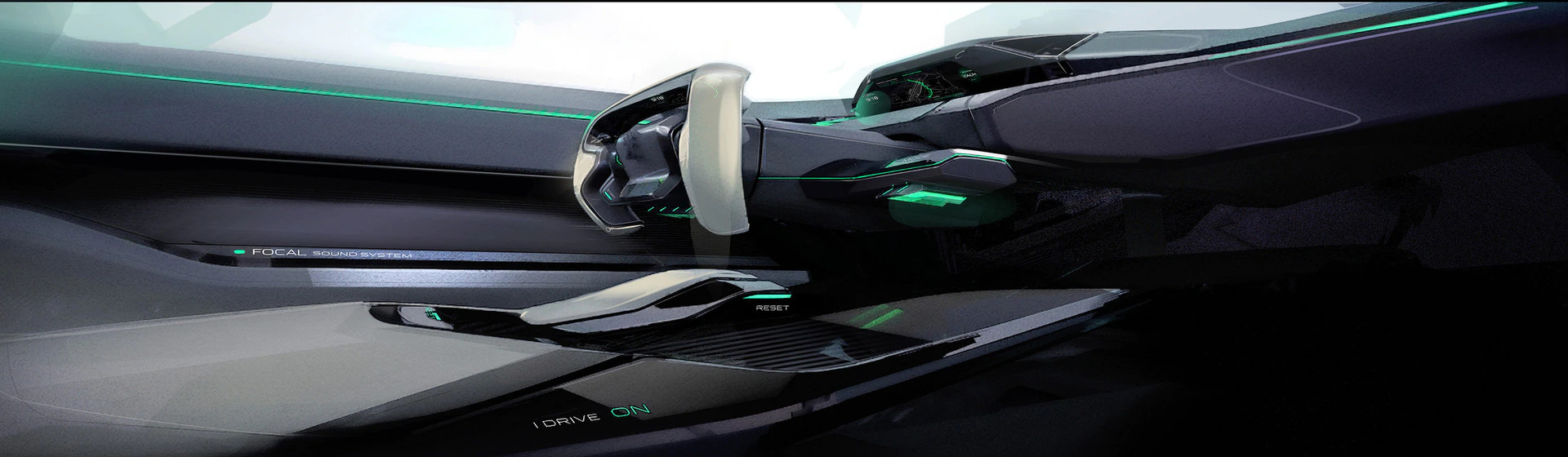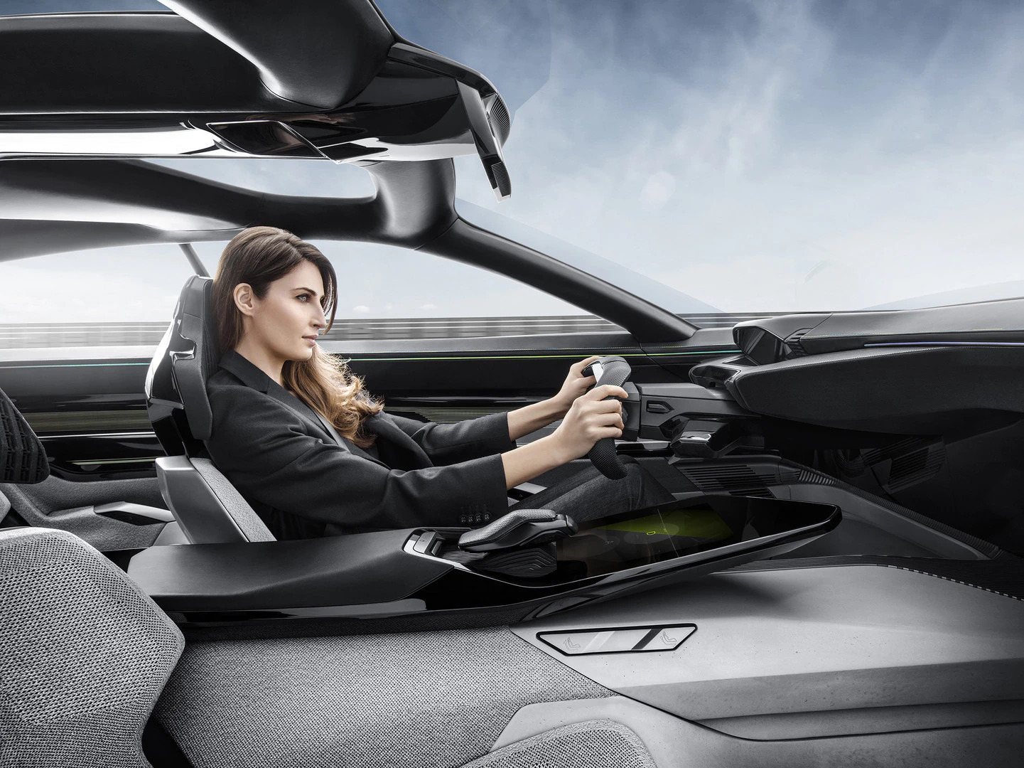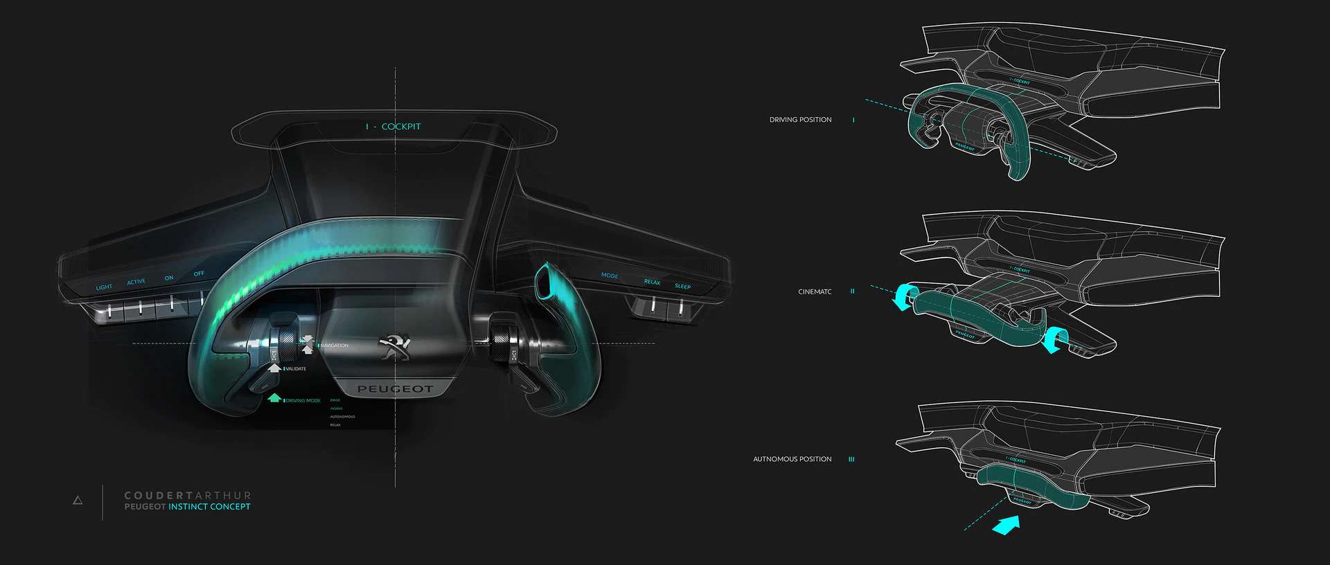 Pārslēdzoties starp Drive un Autonomous režīmiem, vadītāja vidi veido gaisa kinemātika. Kompaktā stūre un toggle switches pamatne ielokās borta panelī. Vienlaicīgi uz paneļa nodziest gāzes pedāļa attēls. Neatkarīgi no aktivizētā režīma vadītājs saglabā kontroli pār automašīnu. Ja tas ir pats par sevi saprotams Drive režīmā, tad šo PEUGEOT autonomas automašīnas funkciju var izbaudīt Autonomous režīmā. Konsolē blakus 9,7 collu ekrānam atrodas i-Device, caur kuru automašīnai var dot komandas. Pietiek ar vienu rokas kustību, lai, piemēram, apdzītu priekšā braucošo automašīnu vai mainītu Soft režīmu uz Sharp režīmu.