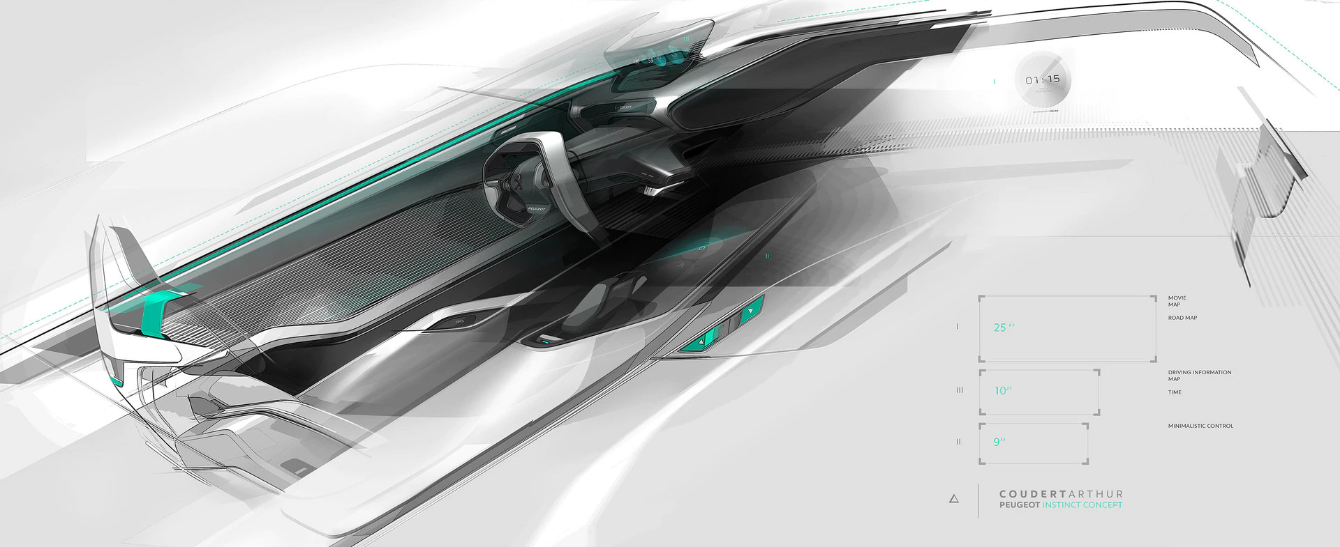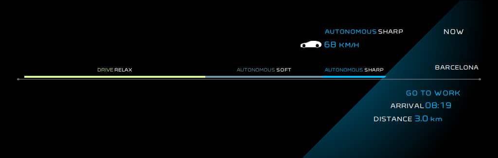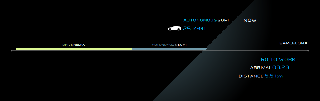 Drive režīmā hologrāfiskais borta panelis sniedz informāciju par braukšanu : automašīnas ātrums, divu enerģiju sadalījums PHEV spēka piedziņas blokā, akumulatora lādiņš... Digitālais atpakaļskata spogulis brīdina par automašīnas esamību aklajā zonā. Autonomous režīmā šie elementi nolasa jaunu svarīgu informāciju, jo tieši laika jēdzienam šeit ir ļoti liela nozīme. Tādējādi visi pasažieri tiek informēti par atlikušo braukšanas laiku līdz galamērķim, tā izmaiņām, ja mainās braukšanas ātrums. Katrā režīmā salonā tiek radīta atšķirīga atmosfēra. Turklāt atbilstoši nolasītajai informācijai, tiek mainīta sēdekļa pozīcija, apgaismojums un skaņas skaļums.